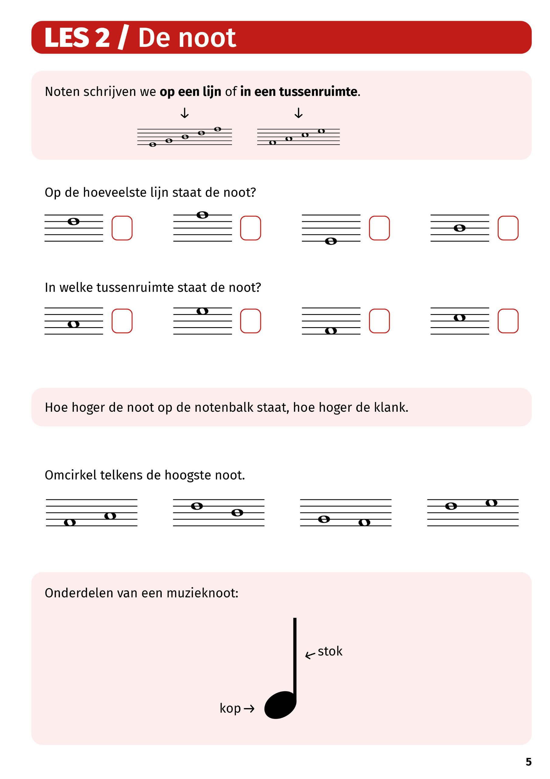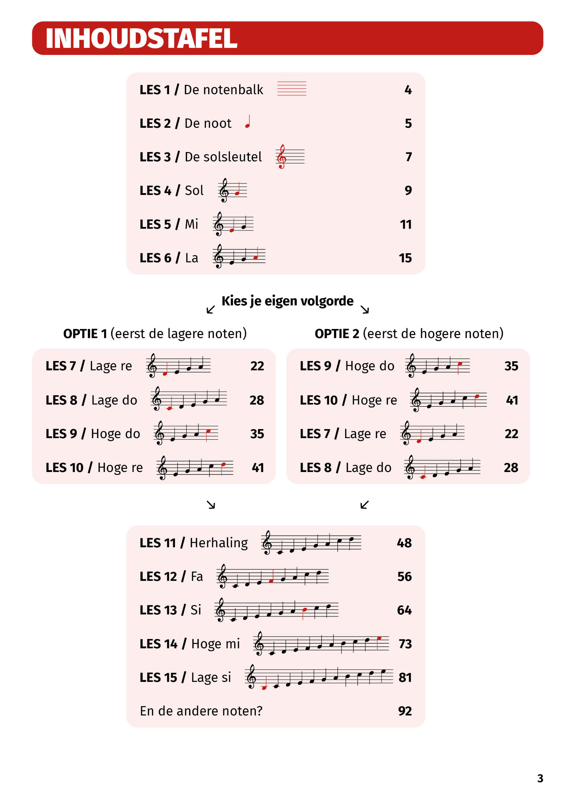 Met dit boek leer je de noten in solsleutel lezen en schrijven. Het gaat hier om de plaats van de noot op de notenbalk (toonhoogte). Ritme (toonduur) wordt niet behandeld.