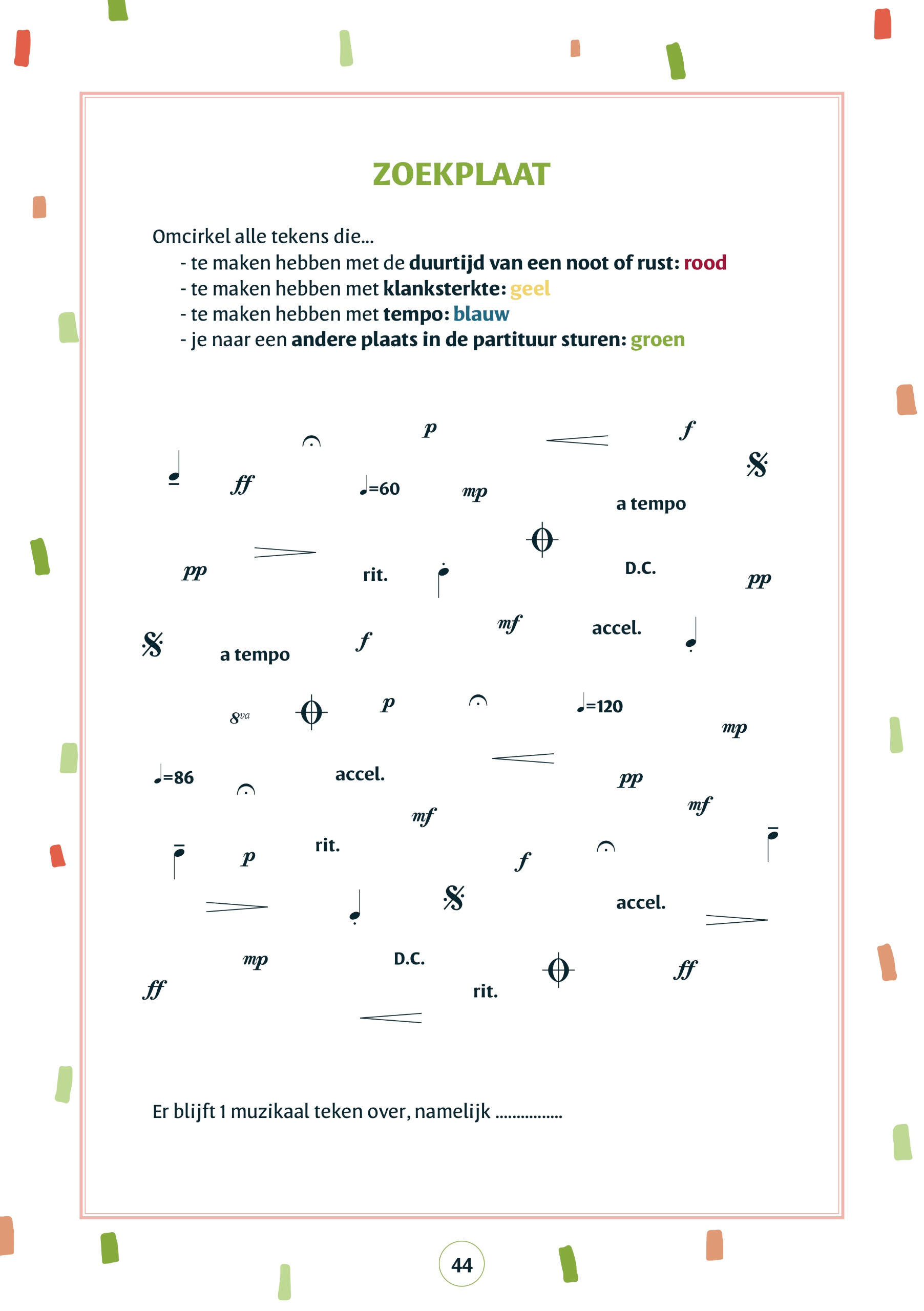 Mijn Vakantieboek Muziek bestaat uit meer dan 50 pagina's met spelletjes, puzzels, weetjes, opdrachten,… om de geleerde noten, ritmes en muziektheorie op een speelse manier te herhalen en verder in te oefenen tijdens de zomervakantie. Ook tijdens het schooljaar kunnen de oefeningen al van pas komen om een bepaald onderdeel extra in te oefenen. De oplossingen zijn achteraan in het boek te vinden.